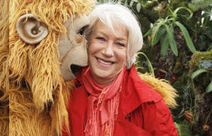 British actress Helen Mirren poses with a man wearing an orangutan costume during media day at the Chelsea Flower Show 2011, May 23, 2011.