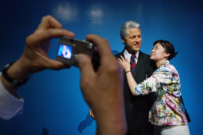 A Chinese (R) poses next to wax statue of former U.S President Bill