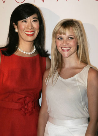 Andrea Jung (L), chairman and CEO of Avon Products, Inc., poses with actress Reese Witherspoon after Jung announced that Witherspoon will serve as Avon's first ever Global Ambassador during a news conference in Beverly Hills, California August 1, 2007. Witherspoon's duties will include being the spokeswoman for Avon's beauty products and serving as honorary chairman of the Avon Foundation which focuses on initiatives on breast cancer and domestic violence.[Reuters]