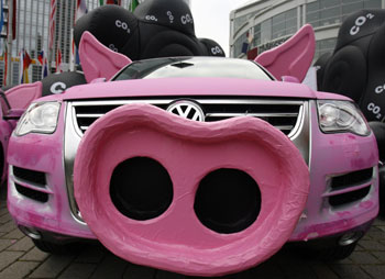Greenpeace activists paint a Passat of German car manufacturer Volkswagen pink and drape a swine snout and ears during a protest against air pollution in front of the international car show IAA in Frankfurt September 13, 2007. [Reuters] |