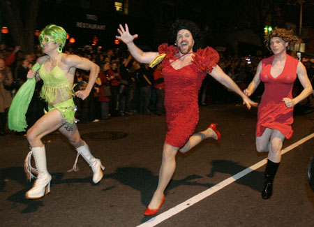 Participants run in the annual High Heel Drag Race at Dupont Circle in Washington October 30, 2007. The event features drag queens parading in costume before racing down 17th street in the Dupont Circle neighborhood each year on the Tuesday before Halloween. [Agencies] |