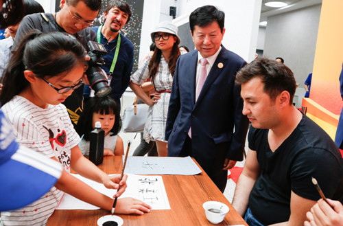 8月9日,哈薩克斯坦國立歐亞大學孔子學院在阿斯塔納世博會中國館舉行書法展演文化交流活動,中國館執行館長姚瑞和孔子學院院長鄧瀅出席并致辭。來自孔子學院的師生和現場游客100余人參加活動。