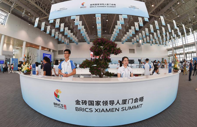 Volunteers work at the media center for the 2017 BRICS Summit in Xiamen, East China's Fujian province, Sept 2, 2017.
