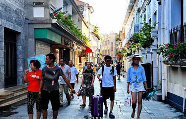 Tourists visit a street in Gulangyu island in Xiamen city, Southeast China's Fujian province, Aug 29, 2017.