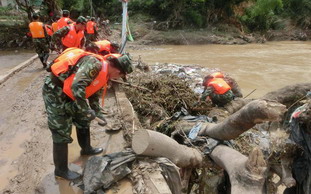 Soldiers clear a bridge following a flood triggered by continuous rain in Pengkou township, Liancheng county in Fujian province, July 26.
