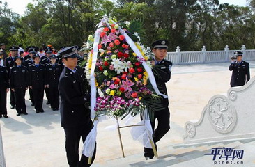 Two police officers lay a wreath in front of a martyr's tomb at a cemetery in the Pingtan Comprehensive Pilot Zone in Fujian province, on April 2.