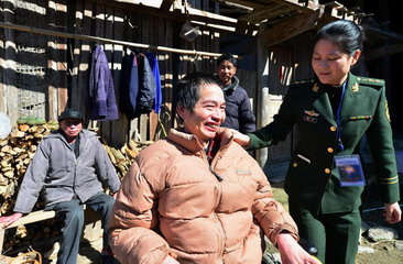A female solider greets Xie Jiquan and his family at the Ziran village, Luoyuan county in Fujian province, Jan 15.