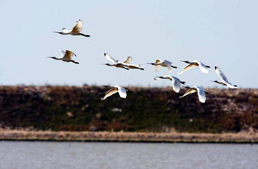 A flock of black-faced spoonbills flies over a wetland in Fuqing county, Fujian province, on Jan 18.