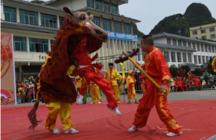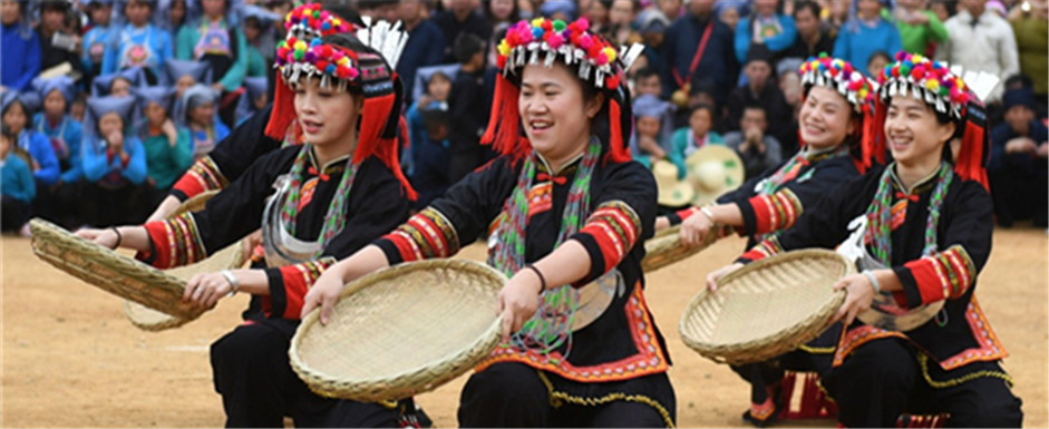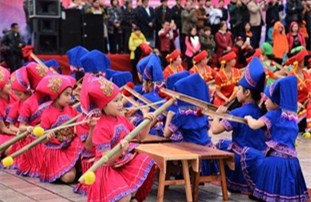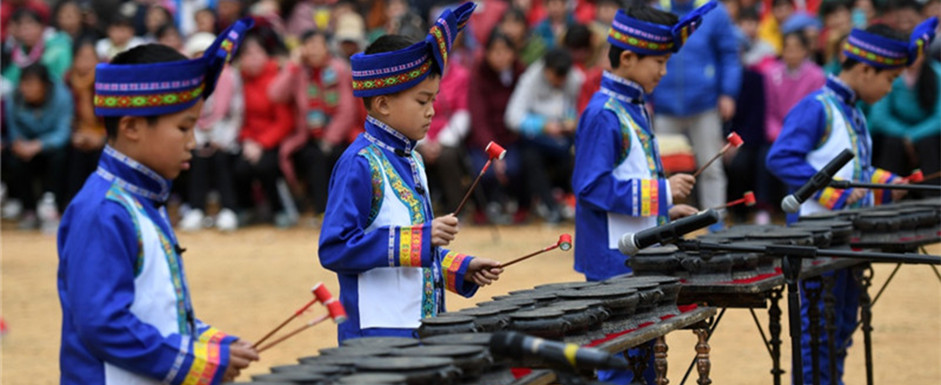 Performers from Luocheng Mulao autonomous county in Hechi staged a show tour in the county on March 26, performing Mulao folk traditions in celebration of the Shangsi Festival.