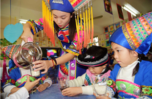 Children at Jinchengjiang No.1 Kindergarten, Hechi, Guangxi Zhuang autonomous region, made five-color sticky rice cakes, a traditional Zhuang food, on March 24, to celebrate the upcoming Shangsi festival.