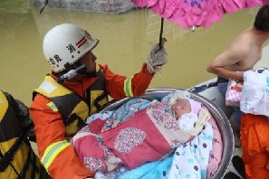 A rescuer transfers a ten-day-old baby out of a flood stricken area in Yanhe county, Guizhou province on June 21.