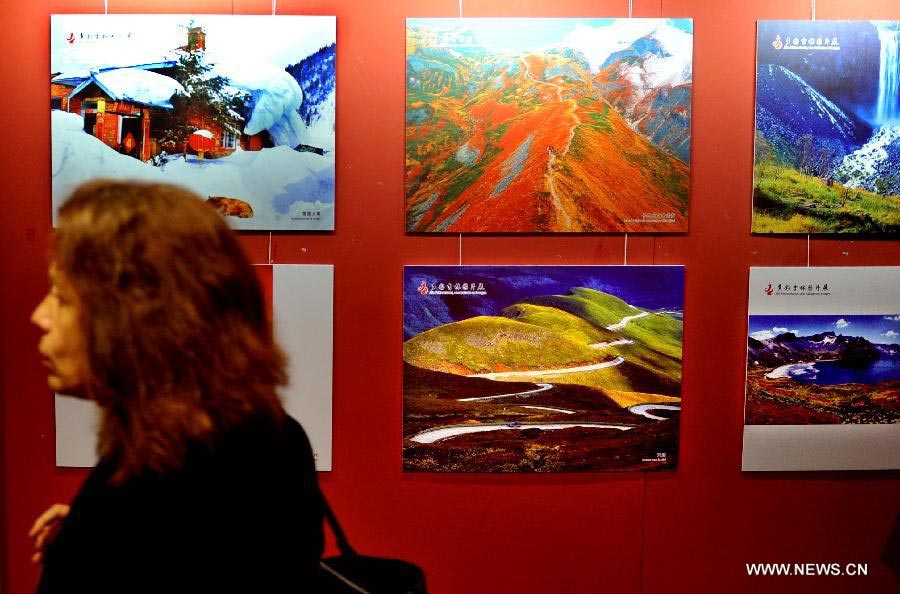 A woman visits a photo exhibition named "Colourful Jilin" which shows the scenery and culture of Chinese Jilin province in Paris, France, on December 2, 2013.[Photo/Xinhua]