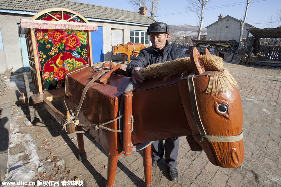Carpenter Li Jingyang, 65, takes care of an electric-powered wooden horse at his residential village courtyard in Yongji County, Northeast China's Jilin province.