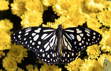 A butterfly is seen among flowers in the Butterfly Valley scenic spot in Yishui county, East China's Shandong province, Oct 6, 2017.