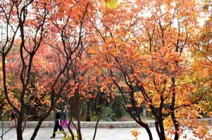 Cotinus coggygria and maple trees with red leaves attracted tourists to view autumn scenery at the Qianfoshan Park in Jinan, Shandong province.