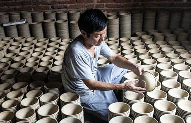 Sun Demin makes a sand bowl at Dongshanzhuang village of Qixia city, East China's Shandong province, July 31, 2017.
