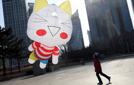 2014-02-04A man flies a kite at a square in Yantai city of Shandong Province, Feb 3, 2014. More than 60 participants fly flew kites to celebrate the Spring Festival.