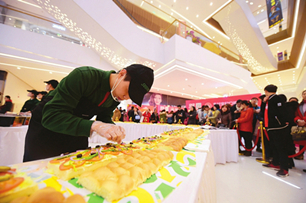 Staff members at a shopping mall in Qinxian Street, Taiyuan, connected a 33-meter sandwich, Dec 12, attracting more than 1,000 visitors who came to eat the giant culinary creation.