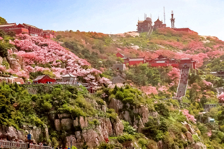 The crabapple trees on Taishan Mountain are in their prime for blossoms in May, carpeting green hills and slopes with pink clusters.