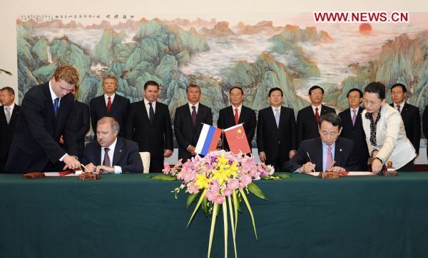 Chinese Vice Premier Wang Qishan and Russian Deputy Prime Minister Igor Sechin attend the document-signing ceremony after the Sino-Russian energy negotiators' meetings in Tianjin, north China, Sept. 21, 2010. Wang co-hosted the sixth round of the Sino-Russian energy negotiators' meetings with Igor Sechin in Tianjin on Tuesday. (Xinhua/Xie Huanchi)
