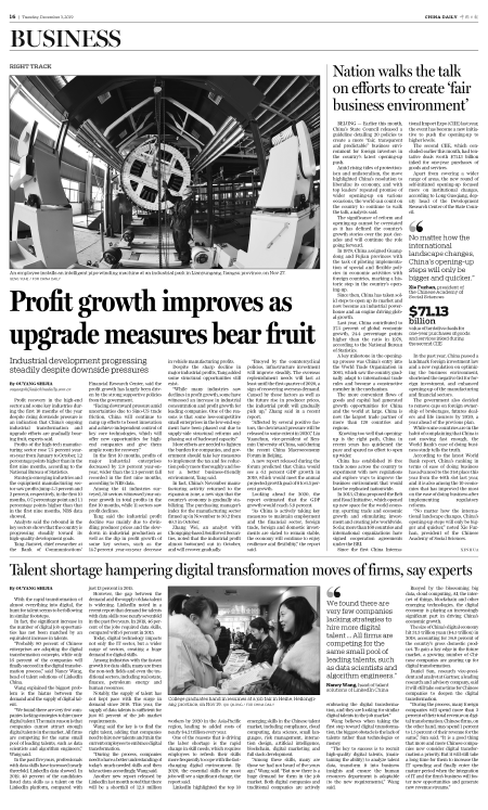 Profit recovery in the high-end sector and some key industries during the first 10 months of the year despite rising downside pressure is an indication that China's ongoing industrial transformation and upgrade efforts are gradually bearing fruit, experts said.