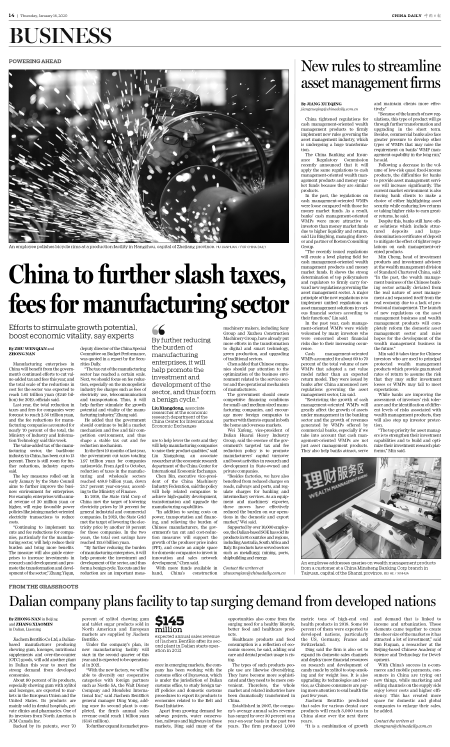 Manufacturing enterprises in China will benefit from the government's continued efforts to cut value-added tax and fees this year, and the total scale of the reductions in cost for the sector was expected to reach 1.65 trillion yuan ($240 billion) for 2019, officials said.