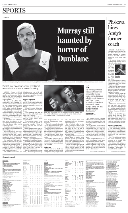 LONDON-Former world No 1 Andy Murray reveals for the first time in a new documentary that he suffered from breathing problems and anxiety following the Dunblane School massacre.