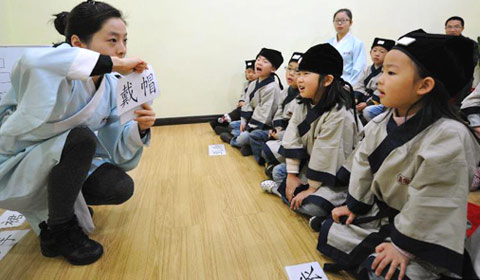Students wearing traditional costumes from Han Dynasty (202 BC-220 AD) have class at a private school in Changsha, capital of Central China's Hunan province.