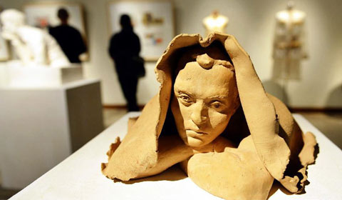 Visitors view art pieces at an exhibition of the excellent art works of 2013 college graduates in Hangzhou, Nov 1, 2013.