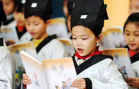 Students read "Lun Yu", or the Analects of Confucius, at Xiyou Primary School in Hefei, capital of east China's Anhui province.