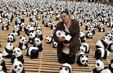 French artist Paul Grangenon poses for photos with his paper panda artworks at an open-air exhibition titled "Pandas World Tour - Taipei" at the Citizens' Square in Taipei, southeast China's Taiwan, Feb. 27, 2014.