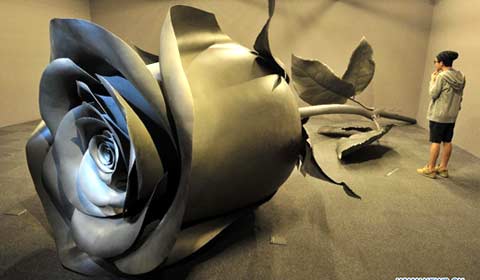 Visitors view artwork by sculptor Cai Zhisong at an exhibition in Museum of Contemporary Art, Taipei, Southeast China's Taiwan, Feb 18, 2014.