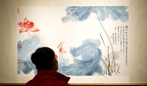 Visitors enjoy paintings by art master Zhang Daqian, at the National Art Museum of China in Beijing, January 20, 2014.