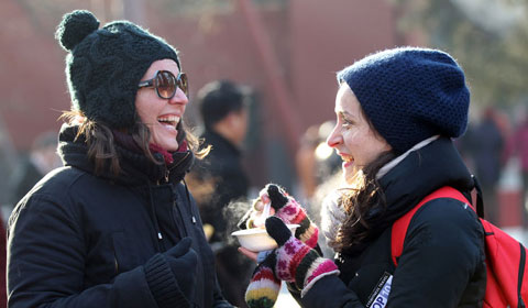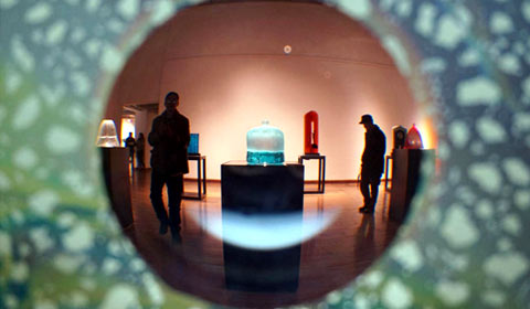 Visitors look at glass art creations at China Academy of Art in Hangzhou, capital of East China's Zhejiang province, Jan 13, 2014.