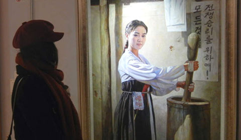 Visitors enjoy oil paintings by DPRK artists at an exhibition hall in Suzhou, Jiangsu province, January 11, 2014.