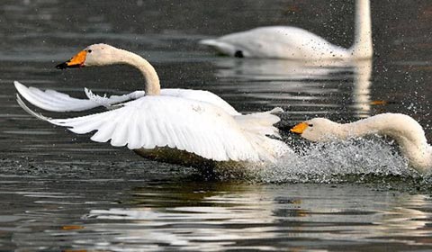 Swans swim at a wetland on the Yellow River in Pinglu county of Yuncheng, north China's Shanxi province, Jan 2, 2014.