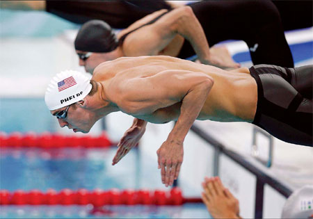 Phelps secured a center lane by downing his own Olympic record at 4:07.82. His main opponent today will be teammate Ryan Lochte, who placed fourth in the heats. Hungarian Laszlo Cseh, who ranked second in the heats, also has a shot at the top three places. In the men's 400m freestyle, China's Zhang Lin edged Park Taehwan, the South Koeran medal hope, to the third with a new Asian record (See sidebar). Australian swimmer Grant Hackett, current world's No 1, entered the final as the fifth fastest. American Larsen Jensen entered the final as the top seed with a new Americas record. In the men's 100m breaststroke, world record holder American Brendan Hansen was edged to the ninth place. Five swimmers broke the old Olympic record of 1:00.01 in the heats that were headed by Norwegian Alexander Dale Oen. "I didn't think I was going that slow," Hansen said after the heat. "It's like we'are playing a big card game and all those guys are showing their hands. We got a lot of peacocks showing their feathers." Other overshadowed "big fish" included Olympic Champion Australia's Libby Trickett, who ranked 12th in the women's 100m butterfly. "I am expecting to be faster tonight," said Trickett, who is currently ranked No1. Veteran Olympian Kirsty Conventry ranked seventh in the women's 400m individual medley, behind 14-year-old Chinese swimmer Li Xuanxun. Olympic debutante American Elizabeth Beisel, who will turn 16 on Aug 18, beat her teammate, top favorite Katie Hoff, ranking first in the heat. The Chinese women were Asian record-breakers yesterday. Their 4x100m freestyle relay team was the fastest in qualifying for the finals in 3:36.78, ahead of Germany, USA, France, the Netherlands and Australia while Zhou Yafei qualified for today's semifinal of the 100m butterfly in 57.70. Xinhua (China Daily 08/10/2008 page14) |