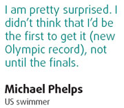 Beijing's Water Cube witnessed unusually fast heats on its first competition day yesterday. Olympic champions were either pushed to set new records or edged to lower ranks by less famous swimmers. But not Michael Phelps, the American superstar who begins his quest for eight gold medals today.
