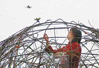 A poet named Ye Fu practises performance art by living in a "nest" constructed near an office building in the CBD area for a month from April 27 to May 27, 2005. Location:Beijing Central Business District Undated Photographer: Anonymous