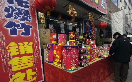 Locals select fireworks at a certificated booth before the 2006 Spring Festival. Beijing municipal government revised related regulations to allow residents to set off fireworks during regulated time spans at permitted places during the Spring Festival. [Xinhua] |