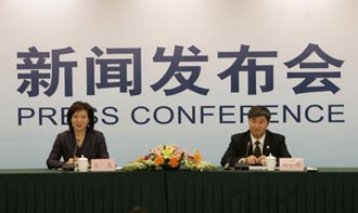 Wang Hui(L), deputy director of media & communication department of the organizing committee and Liu Xiaoming, spokesman for Beijing's Transportation Commission. [BOCOG] |