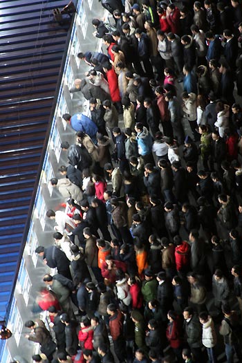 People queue to purchase tickets at the West Railway Station of Beijing (Beijing Xi Zhan) - by newsphoto in February of 2007