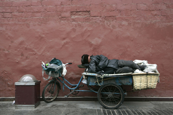 A labourer sleeps on a tricycle near a red wall beside Tiananmen Square in Beijing March 1, 2007.[Reuters]