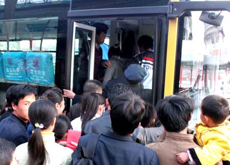 People struggle to board a bus in Yinchuan, the capital city of northwestern China's Ningxia Hui Autonomous Region on Sunday, March 11, 2007. The same day was declared the second official "Queue Day" in Beijing to remind residents of the benefits of lining up for things. Experts say the days should be introduced in other cities to provide people with a better understanding of social etiquette. [Xinhua]