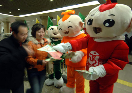 Volunteers in cartoon figures'customs send around the flysheet to passengers at Beijing Wangfujing metro station to promote the second official "Queue Day" in Beijing March,11,2007.The "Queue Day" to remind residents of the benefits of lining up for things. Experts say the days should be introduced in other cities to provide people with a better understanding of social etiquette. [Xinhua]