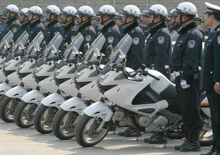 An array of police stand beside the motorcycles at Tiananmen Square in central Beijing Apirl, 10, 2007. Beijing Traffic Management Bureau has equipped the police with uptodate motorcycles and patrol wagons, who are on duty in central Beijing's Chang An Avenue, gearing up the drilling of traffic management for the upcoming Olympic Games.[newsphoto]