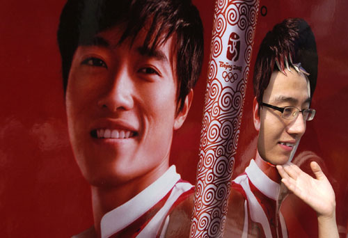 A Taiyuan citizen poses beside the picture of China's Olympic champion and world record holder of 110m hurdles Liu Xiang at the name board for supporting the Olympic Touch bearer competition in Taiyuan, capital city of North China's Shanxi Province July 8, 2007. [Xinhua]