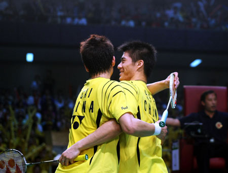 China's Cai Yun (L) and Fu Haifeng celebrate after winning men's doubles game against Markis Kido and Hendra Setiawan of Indonesia during China Masters Badminton tournament in Chengdu on Sunday. [Xinhua]