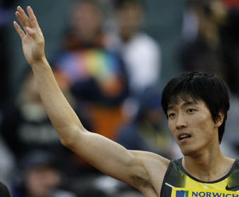 Liu Xiang of China celebrates winning the men's 110 metres hurdles during the British Grand Prix athletics meet at the Don Valley Stadium in Sheffield, northern England July 15, 2007.[Reuters]