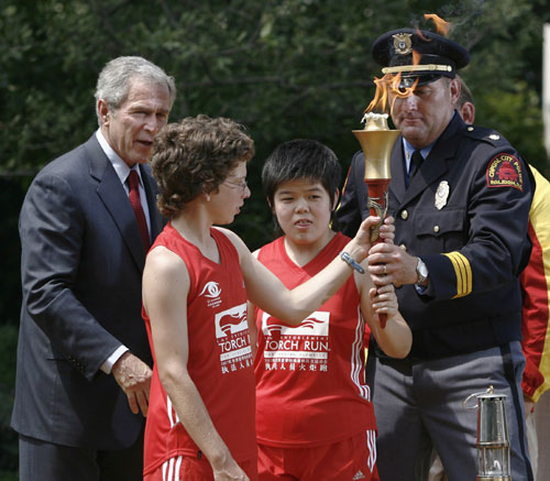 U.S. President George W. Bush (L) watches as Special Olympics athletes Karen Dickerson (2nd L) from Springfield, VA, and Oiao Meili from China take part in a Special Olympics global law enforcement torch run ceremony with Major Michael Teem (R) from the Raleigh Police Department in the Rose Garden of the White House in Washington, July 26, 2007. [Reuters]